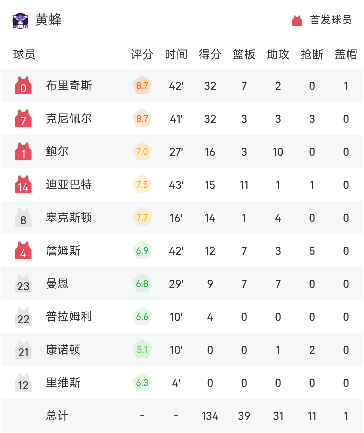 6686体育app11月15日讯 25/26赛季NBA 常规赛 NBA杯分组赛,雄鹿对阵黄蜂。双方全场战罢,雄鹿147-134战胜黄蜂。库兹马得到29分10板5助率队取胜,布里奇斯空砍全场最高的32分7板2助。