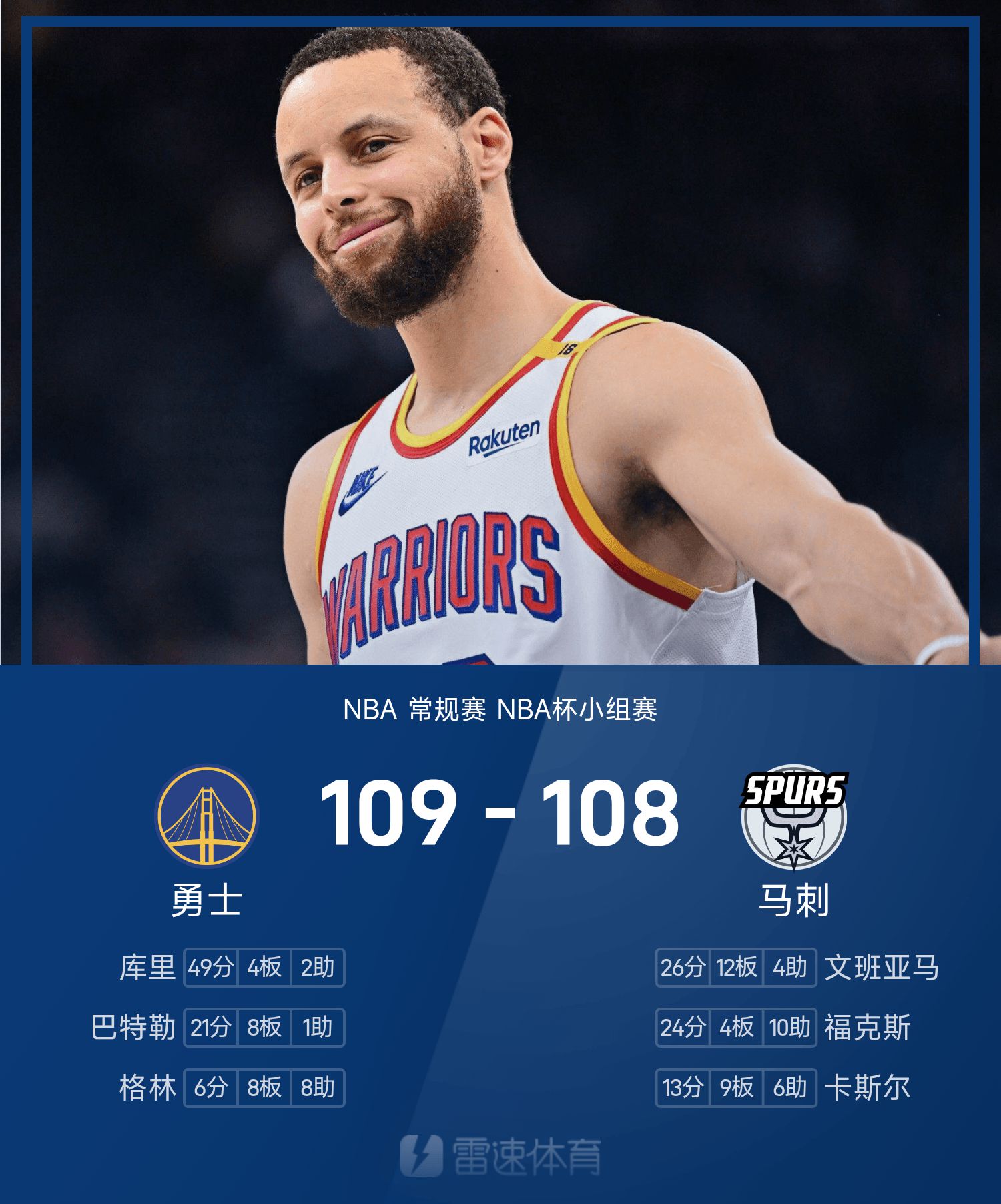 勇士109-108马刺