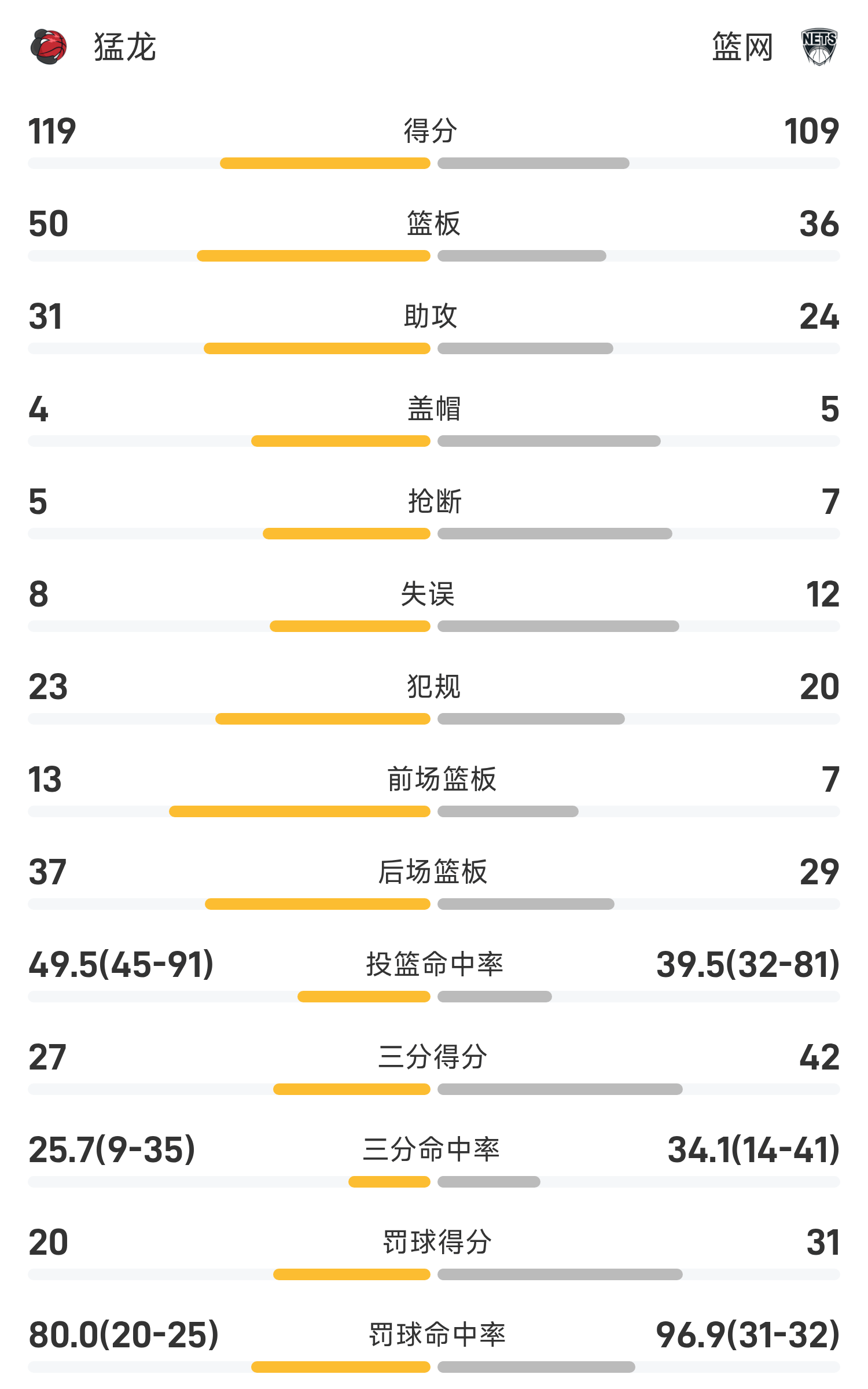 双方全场战罢,篮网109-119不敌猛龙。