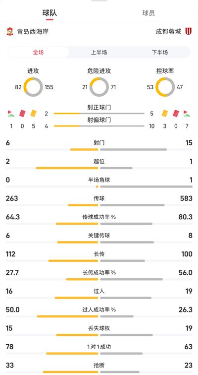 西海岸vs蓉城全场数据:打门6-15,盘球率53%-47%