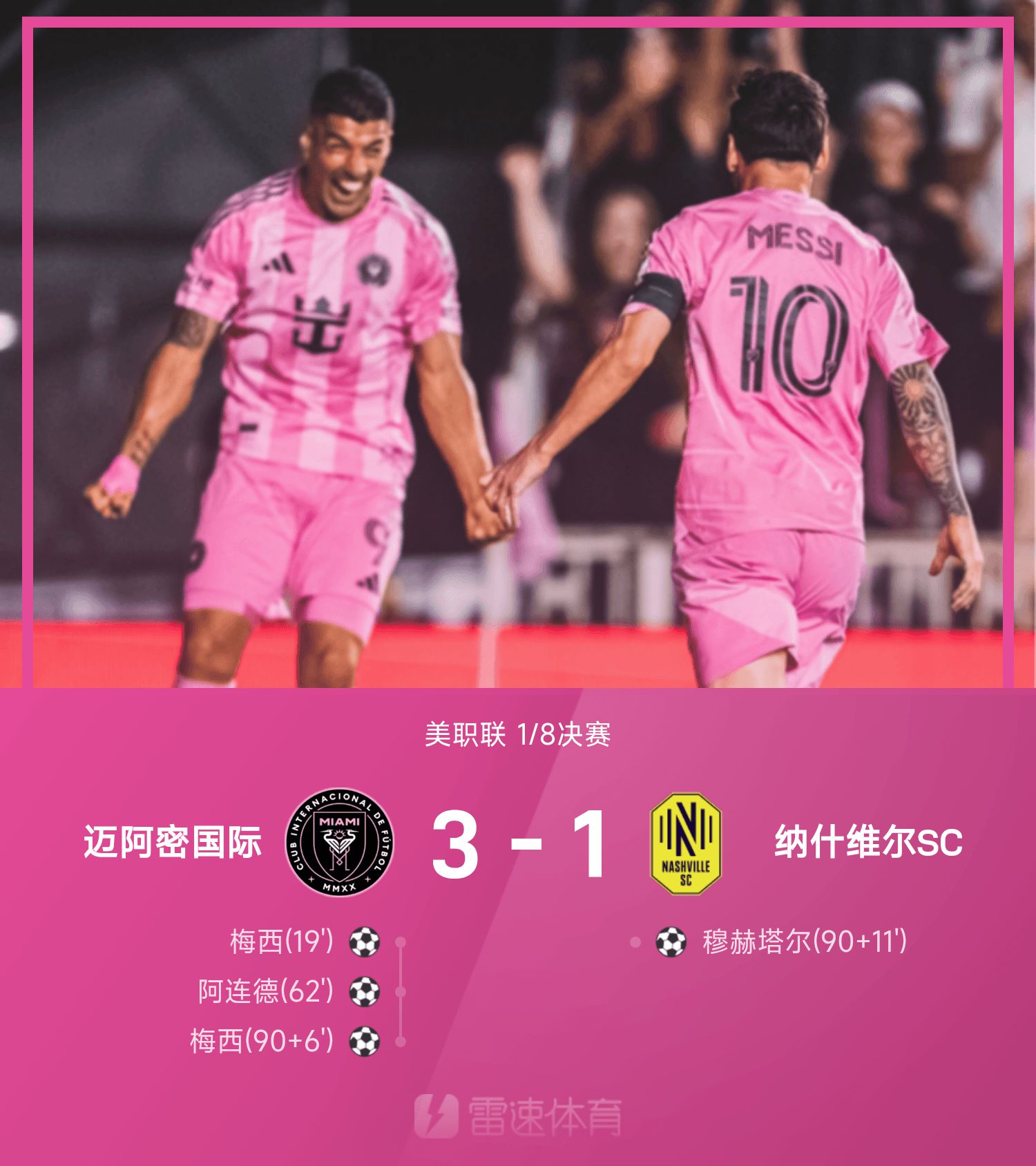6686体育app10月25日讯 2025赛季美职联1/8总决赛首回合,迈阿密国际主队场对阵纳什维尔SC。全场竞赛,梅西上演梅开二度好戏,阿连德也头槌破门,穆赫塔尔虽压哨进球但无济于事,最终迈阿密国际3-1击败纳什维尔,大赛果分1-0领跑位对手。
