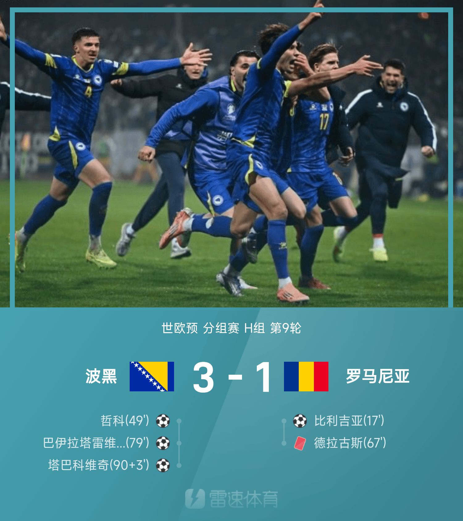 世欧预战报:塔巴科维奇制胜,波黑3-1胜十人罗马尼亚
